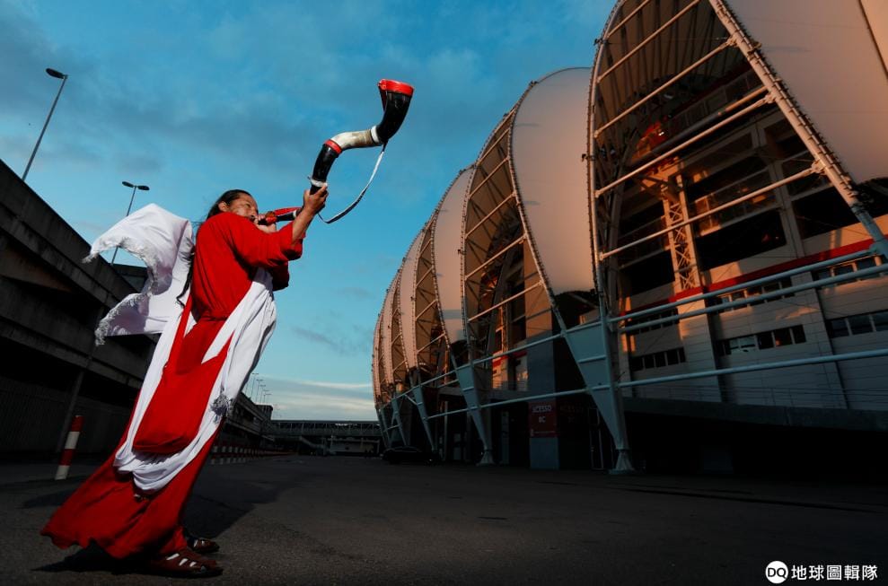 在舉辦 2019美洲盃足球賽的巴西阿雷格里港(Porto Alegre)格雷米奧競技場(Arena do Grêmio)外,一名打扮成天使的秘魯球迷吹響號角為正在裡頭練習的秘魯隊加油。