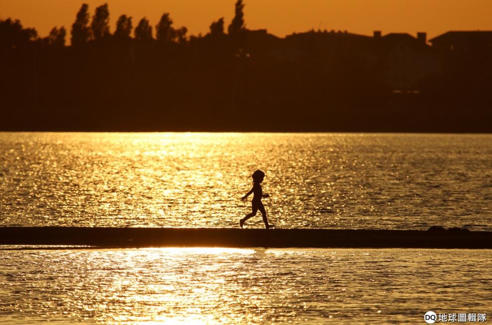 在克里米亞半島的莫伊納基湖(Lake Moynaki),一名孩童襯著夕陽跑過湖中央的沙洲。