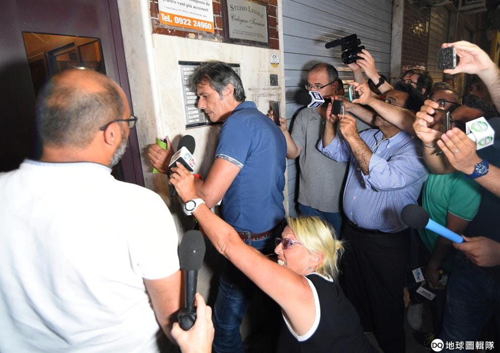 在西西里島,一名便衣警官(圖中藍衣者)前來探訪德國非營利組織「海洋觀察」(Sea-Watch)的救難船船長拉奎特(Carola Rackete)。