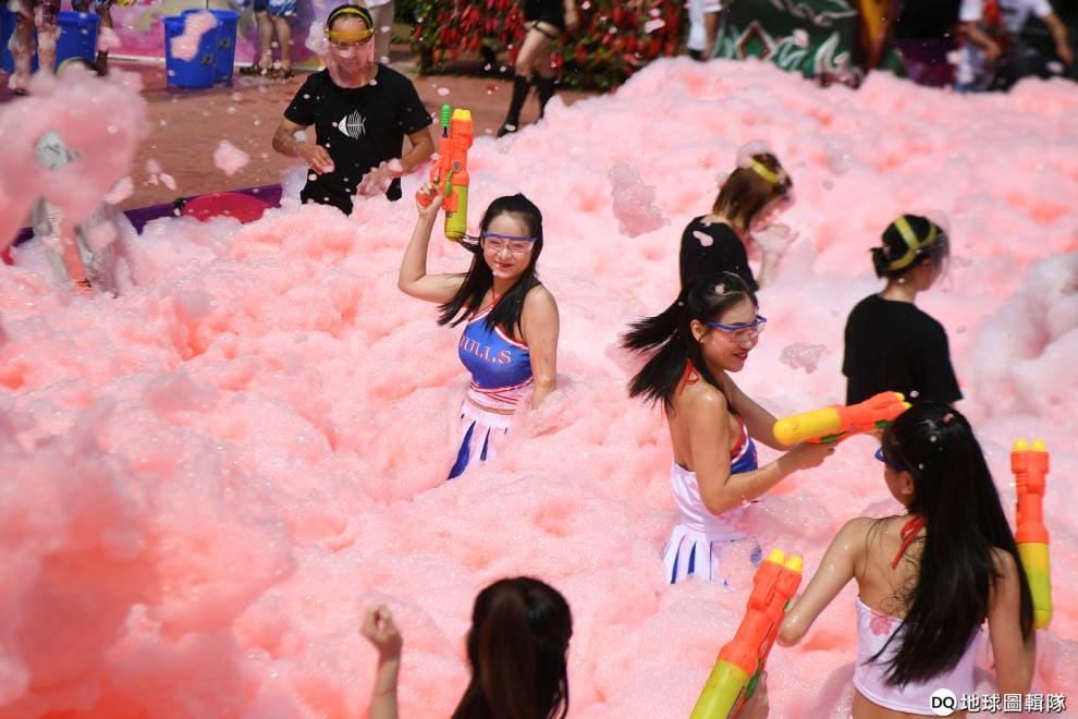 在湖南省寧鄉市,人們在加了辣椒水的泡泡浴中打水仗。