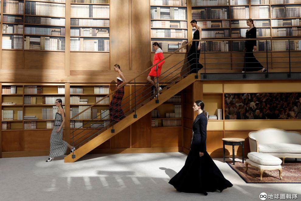 在法國精品品牌香奈兒(Chanel)的 2019/2020秋冬高級訂製服大秀上,模特兒在布置成圖書館模樣的伸展台上走秀。