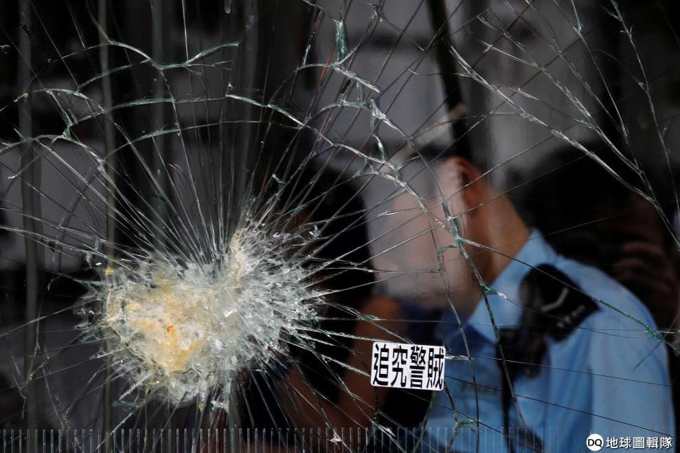 2號這天,一名警察走過立法會建築被砸碎的玻璃,玻璃上貼有「追究警賊」的貼紙。