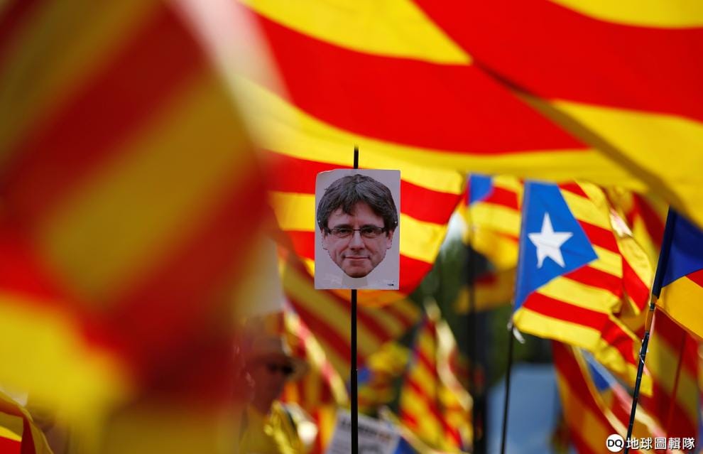 在位於史特拉斯堡(Strasbourg)的歐洲議會(European Parliament)前,民眾高舉加泰隆尼亞自治區旗幟,以及前加泰隆尼亞自治區領導人普伊格蒙特(Carles Puigdemont)的照片抗議。