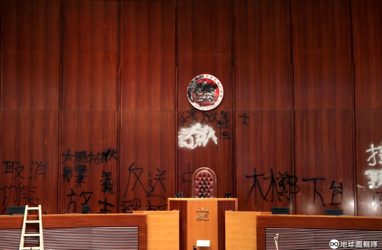 本月 1號,數百名民眾衝入立法會建築,並且佔領立法會好幾個小時,他們將桌椅翻倒、用噴漆在牆面上噴標語,並且拉起「沒有暴徒,只有暴政」的黑色旗幟。