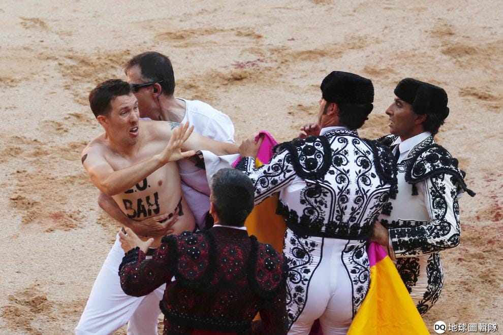 在一年一度的西班牙奔牛節上,一名動保人士衝進鬥牛場中抗議這項活動的殘忍,最後遭助理鬥牛士架離現場。