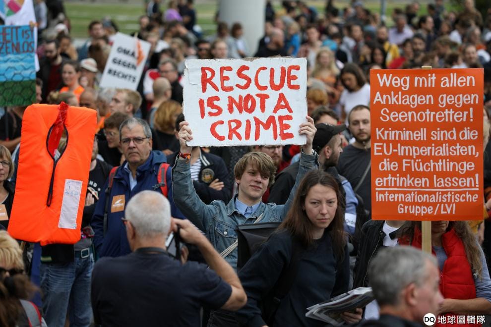 在柏林街頭,民眾上街替冒死橫跨地中海來到歐洲的移民爭取權利,呼籲歐洲各國對移民展開雙臂。其中,一名男子手舉「救人不是犯罪」的標語,呼應近日德國非營利組織「海洋觀察」(Sea-Watch)救難船船長拉奎特(Carola Rackete)的義行。