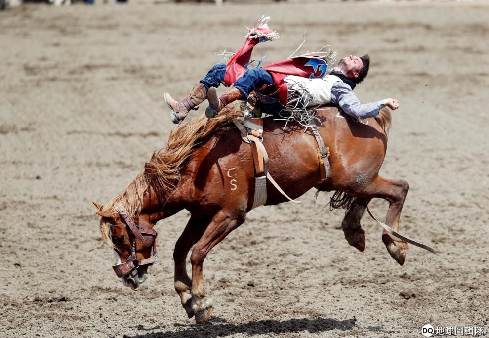 在「卡加利牛仔節」(Calgary Stampede rodeo)上,一名牛仔正在展現他高超的騎馬技巧。該節日成立於 1884年,一開始是為了對外推廣卡加利,以及鼓勵住在加拿大東部的農民遷到西部,時至今日,這項活動已經成為包含博覽會和牛仔競技的大型慶典,年度入場人數超過 100萬人次。