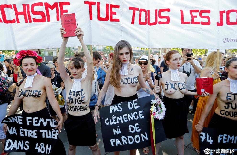在巴黎街頭,反對向女性施暴的運動人士和受害者家屬齊聚一堂,用身體抗議性別暴力。