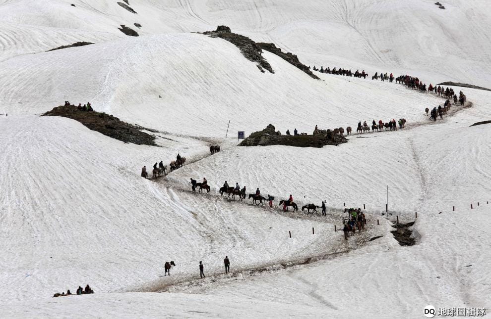 印度教信徒越過白雪遍布的山丘,準備前往阿馬爾納特石窟(Amarnath)朝聖,該洞窟裡的冰石筍被視為濕婆林伽(Lord Shiva)的化身,因此是信徒心中最神聖的朝聖地之一。