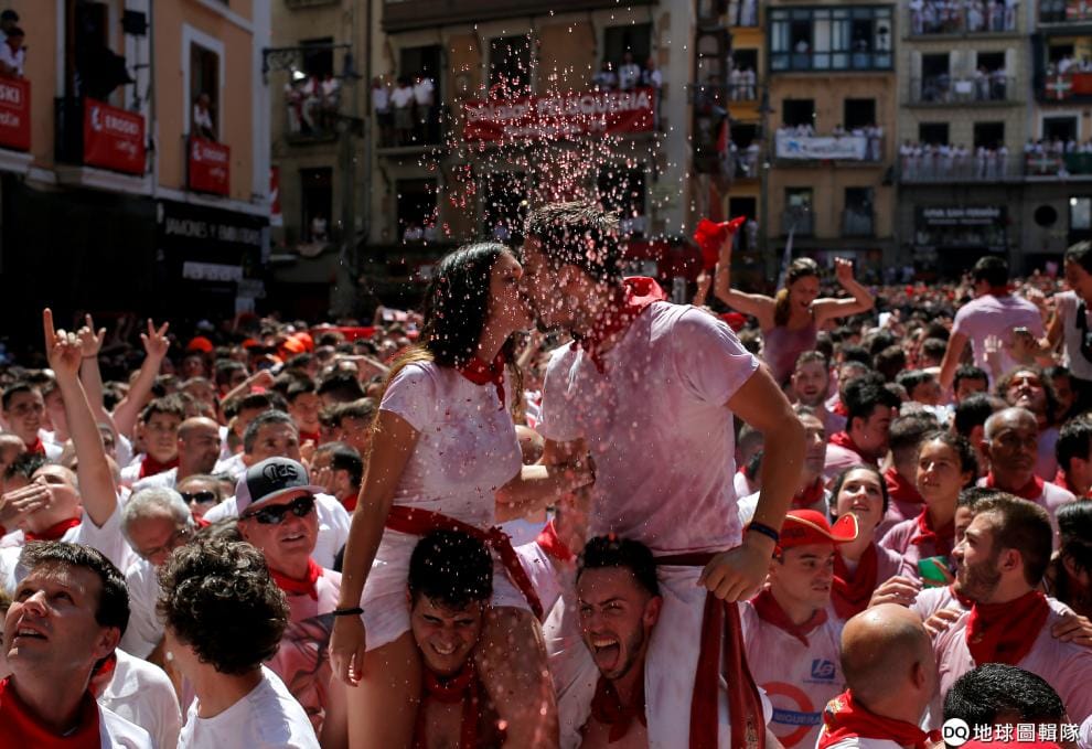 在西班牙奔牛節(Los sanfermines,也稱聖費爾明節)的開幕儀式上,一對受到歡樂氛圍感染的伴侶以親吻紀念這一刻。