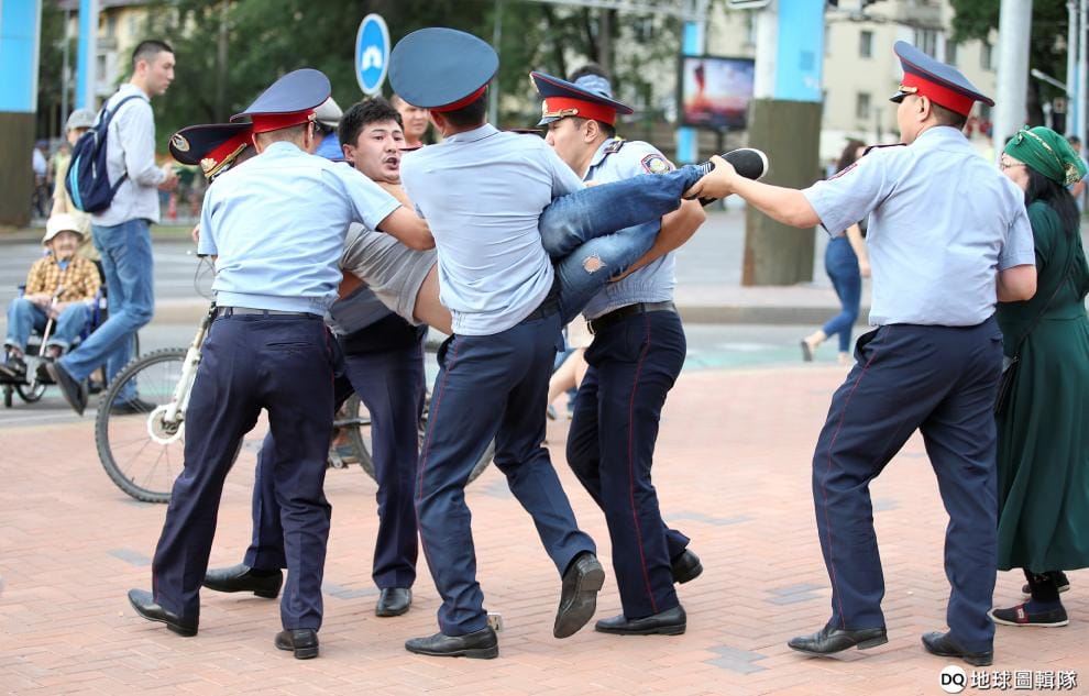 在哈薩克第一大城阿拉木圖(Almaty),好幾個執法人員一同把示威者架離現場,整起示威是由反對黨所發起。