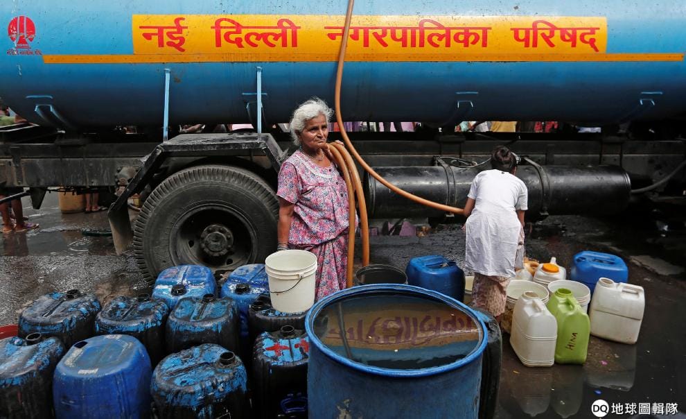 一名女子在水車前等著要裝水。這陣子,印度首都新德里(New Delhi)面臨了嚴重的缺水危機,其背後也反應了政府對水資源管理不佳的問題。