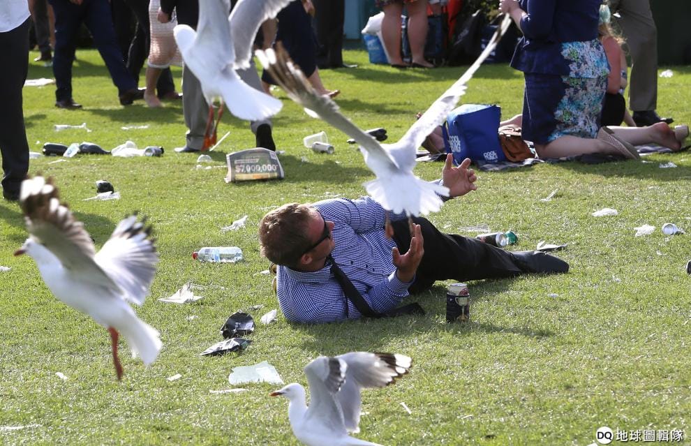 在澳洲墨爾本的費萊明頓賽馬場(Flemington Racecourse),可以看到海鷗在佈滿垃圾的草地上尋找食物。