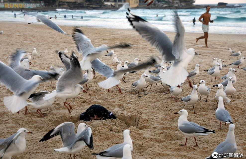 在位於雪梨的邦迪海灘(Bondi Beach),成群的海鷗讓著一名被朋友埋在沙中的男子,他的身旁被撒了餅乾。