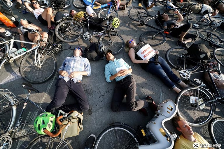 示威者和成堆的腳踏車一同躺在紐約曼哈頓街頭,希望大眾重視腳踏車導致的死傷事故。