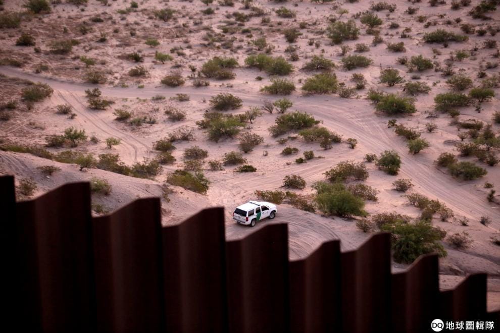 隔著美墨邊境的圍籬,一台美國邊境巡防隊的車輛正在巡邏著。