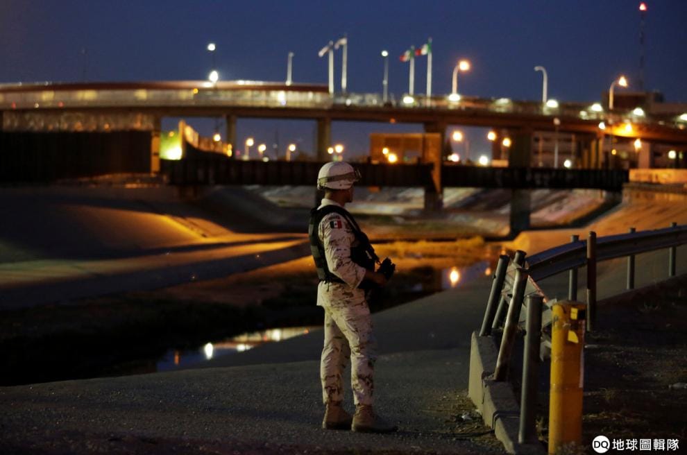 墨西哥國家警衛的成員荷槍實彈,在美墨邊界上警戒著。