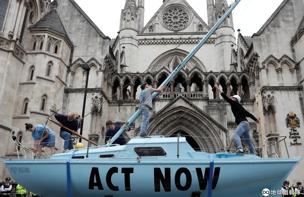 環保團體「反抗滅絕」(Extinction Rebellion)在英國皇家司法院搭起船隻,希望各界可以重視氣候變遷議題,也希望政府當局可以趕快採取行動。