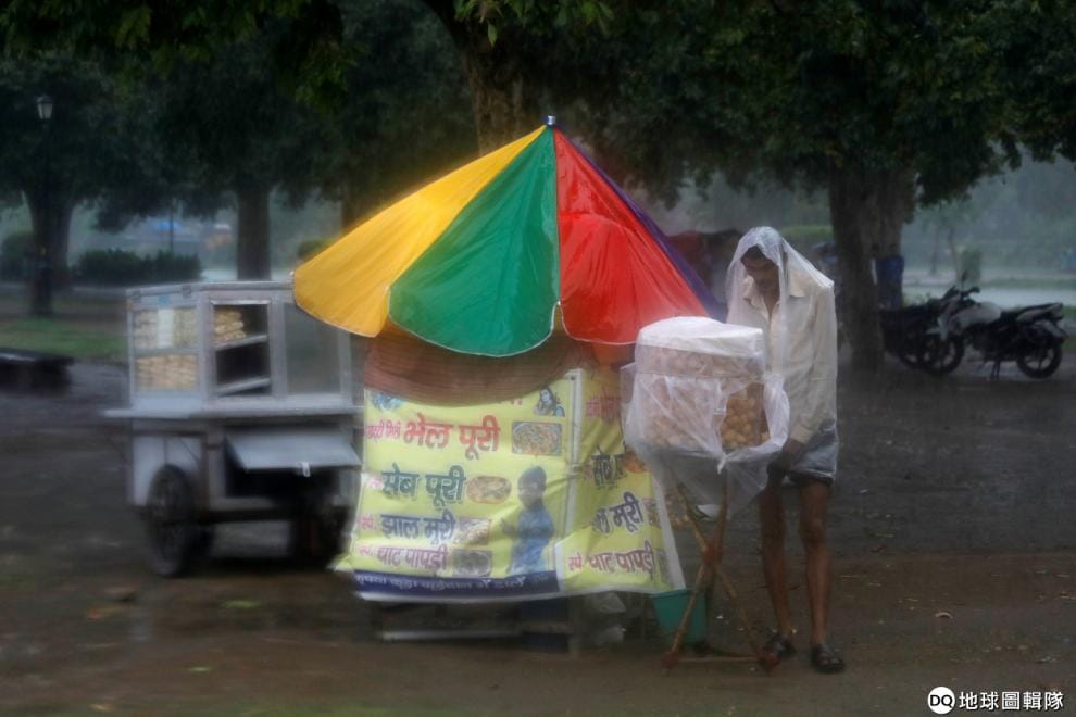 面對新德里突然下起大雨,一名小販披上衣服充當雨衣,並用塑膠布擋好自己的商品。