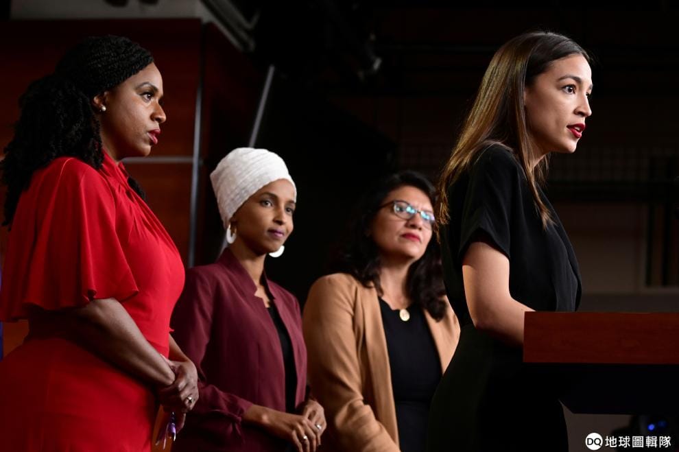 畫面中從左到右分別是美國首位黑人女聯邦眾議院議員普瑞斯利(Ayanna Pressley)、索馬利亞裔議員歐瑪爾(Ilhan Omar)、巴勒斯坦裔議員特萊布(Rashida Tlaib)、西語裔議員寇特茲(Alexandria Ocasio-Cortez),她們正在記者會上發表談話。