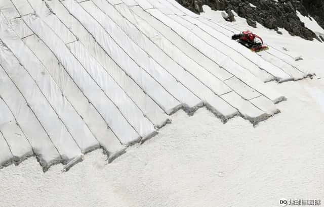來到 2,961公尺高的格姆斯托山(Mount Gemsstock),座落於此的安德馬特瑞士阿爾卑斯度假村(Andermatt Swiss Alps resort)為了緩解格勝冰河(Gurschen gletscher)的融化速度,決定替冰河蓋上帆布,希望能緩解當地冰河的融化速度。