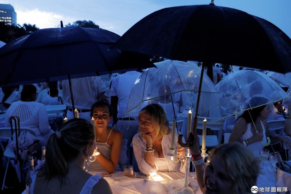 身穿白衣的人們撐起雨傘,坐在披著白色桌巾的白色餐桌旁,用白色餐具一同享用他們的露天晚餐。這裡正在舉辦「2019年紐約白色晚宴」(2019 NYC Diner en Blanc)。