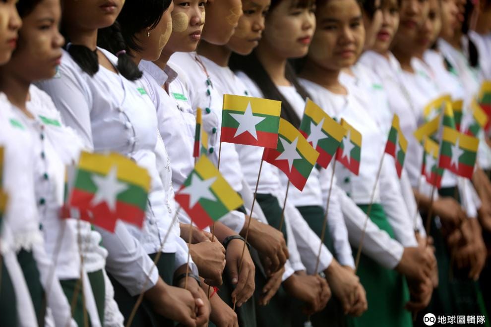 學生們拿直著緬甸的國旗,等著緬甸實質領導人翁山蘇姬(Aung San Suu Kyi)抵達現場。
