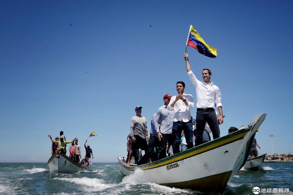 委內瑞拉臨時總統蓋多(Juan Guaido)來到的港口城市波拉馬爾(Porlamar),揮舞著委內瑞拉的旗幟向支持者打招呼。