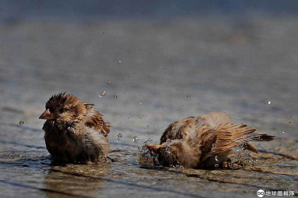 在羅斯‧甘迺迪綠道公園(Rose Kennedy Greenway)裡,兩隻小鳥用公園裡的噴水池好好地消暑一番。