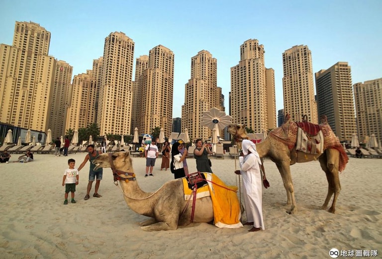 在朱美拉海灘(Jumeirah)上,趴在這裡的駱駝引起觀光客的圍觀拍照,這一帶也是許多度假飯店座落的地區。