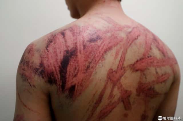 在香港一間醫院內,元朗暴力事件的受害者對著鏡頭露出血痕斑斑的背部,這是他遭到白衣男子暴力攻擊的證據。