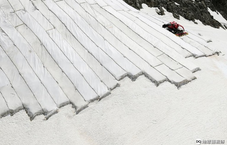 來到 2,961公尺高的格姆斯托山(Mount Gemsstock),座落於此的安德馬特瑞士阿爾卑斯度假村(Andermatt Swiss Alps resort)為了緩解格勝冰河(Gurschen gletscher)的融化速度,決定把一片又一片的白色帆布蓋在冰河上,透過隔絕高溫、反射太陽光的方式來保護冰河。該度假村解釋道,如此一來,他們就能在 11月初、不多花錢使用人造雪的情況下,讓冬季滑雪客能提早享受滑雪之樂。