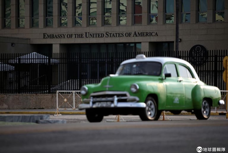 在首都哈瓦那(Havana),一輛綠色的經典老爺車緩緩開過美國大使館。
