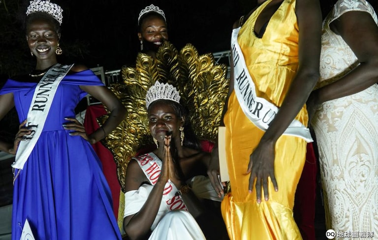 在首都朱巴(Juba),選美佳麗們穿著華服接受眾人的喝采,畫面中央身穿白色禮服的是這一屆的南蘇丹世界小姐選美冠軍──今年 22歲的納亞耶娜(Mariah Nyayeina)。