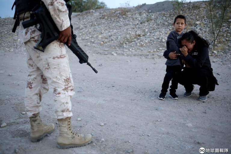在美墨邊界的華瑞茲城(Ciudad Juarez),來自瓜地馬拉的移民佩瑞茲(Lety Perez)蹲在地上抱著兒子安東尼(Anthony Perez),向眼前的墨西哥國家守衛隊(Mexican National Guard)成員哀求,讓他們能順利橫跨邊界到美國。