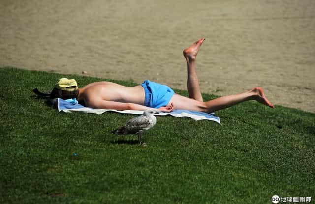 在遭到熱浪襲擊的馬拉加省(Málaga),一名男子脫掉上衣躺在草地上做日光浴。
