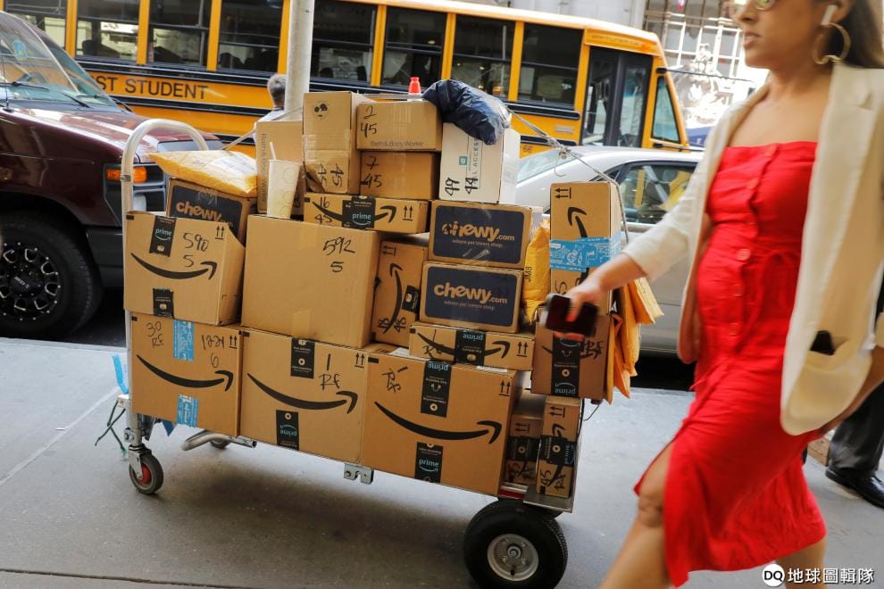 在紐約市,一輛放滿亞馬遜(Amazon)包裹的推車被擺在人行道上。