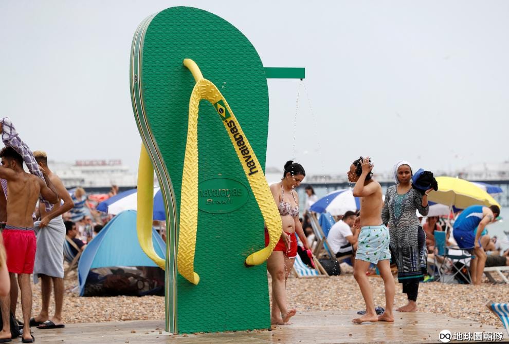 在度假勝地布萊頓海灘(Brighton beach),前來消暑的遊客在巴西人字拖「哈瓦仕」(Havaianas)形狀的沖水台下沖涼。