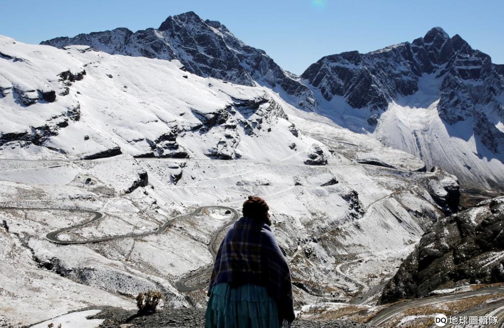 在暴風雪過後,一名女子在靠近首都拉巴斯(La Paz)的La Cumbre看著眼前的雪山。