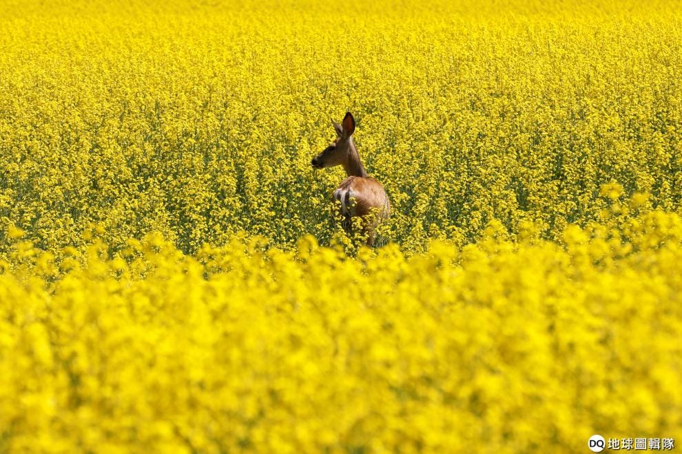 在開滿油菜花的亞伯達省(Alberta)鄉間,一頭鹿隱身在油菜花田中。