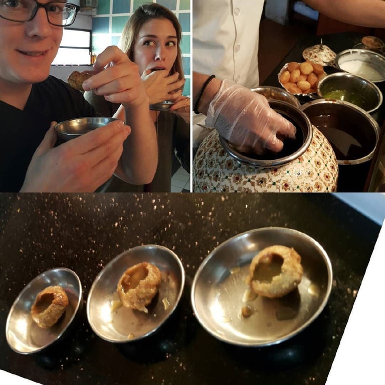 還有一種叫香料水醬酥炸球(Pani Puri)的街頭小吃,更是印度人的最愛,總要在傍晚6、7時來上一小碟。這款小吃隨著地域不同,在北印度叫Golgappa,在中印度叫Gupchup,在西印度又叫Foochka,但指的都是同一種小吃。