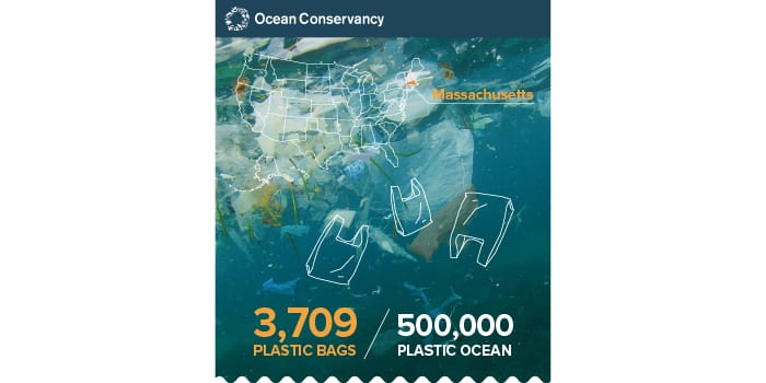 根據非營利組織海洋保護協會(Ocean Conservancy)最新發佈的年度報告,在2017年的全球淨灘行動(International Coastal Clean-up)中,共於波士頓所屬的麻薩諸塞州(以下簡稱麻州)沿岸拾獲將近50萬件垃圾,其中包括3,709個塑膠提袋;又根據美國國家海洋暨大氣總署表示,進入溫度相對較低、日照相對較少的海洋環境後,即便是那些標榜「可生物降解」的塑膠製品,都有可能無法完全分解,而永遠留存於海洋之中。