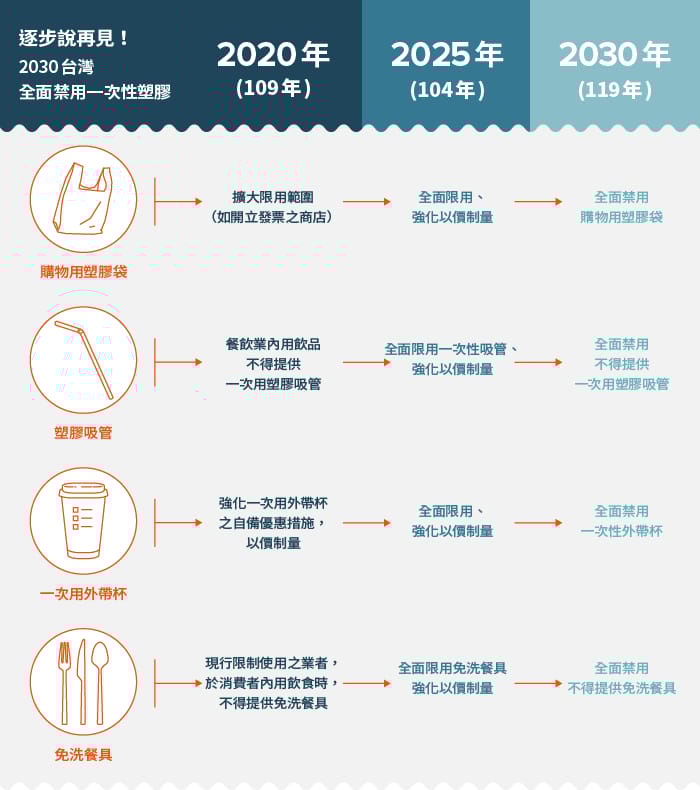 至於我們台灣呢?早在十餘載前的2006年,行政院環境保護署就公告了「購物用塑膠袋限制使用對象、實施方式及實施日期」,規範政府部門、公立醫療院所、公私立學校、百貨公司、購物中心、量販店、超級市場、連鎖便利商店、連鎖速食店等場所不得「免費」提供購物用塑膠袋。