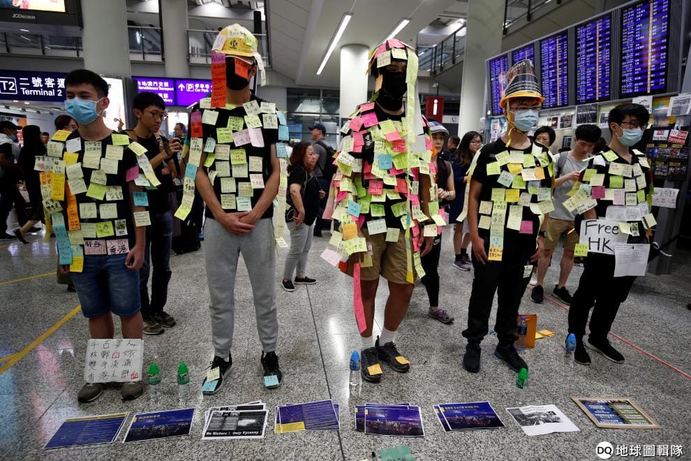 在人來人往的香港機場,抗議元朗暴力事件的民眾穿起便利貼裝,希望能讓路過的民眾瞭解目前在香港發生的警民衝突等情況。