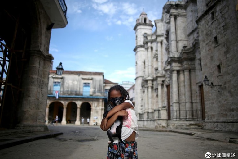 在首都哈瓦那大教堂(Cathedral of Havana)外,一名小女孩抱著小狗在鏡頭前留影。