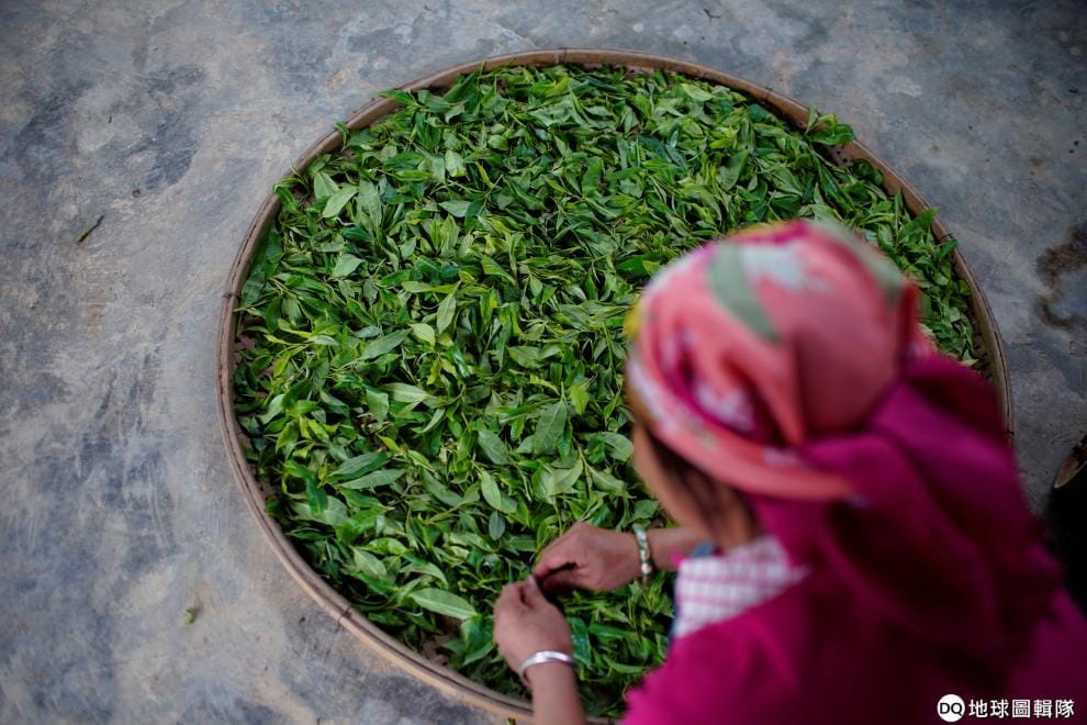 在西雙版納傣族自治州,製茶工人正在將一片片茶葉曬乾。