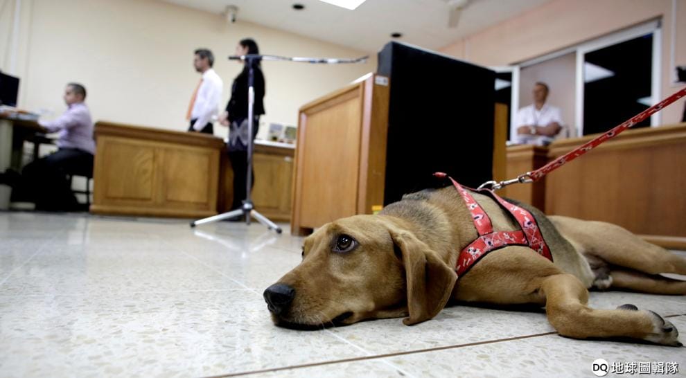 名叫「冠軍」的狗狗趴在地上,牠正在參加前主人虐待牠的法庭審判,這也是哥斯大黎加第一起針對虐狗飼主的裁判。