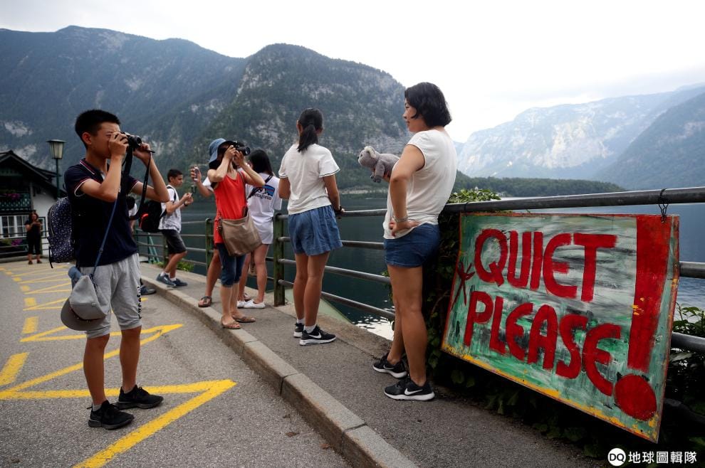 在被封為世界最美小鎮的哈爾施塔特(Hallstaettersee)小鎮,川流不息的觀光客正在與如詩如畫的湖景合影。