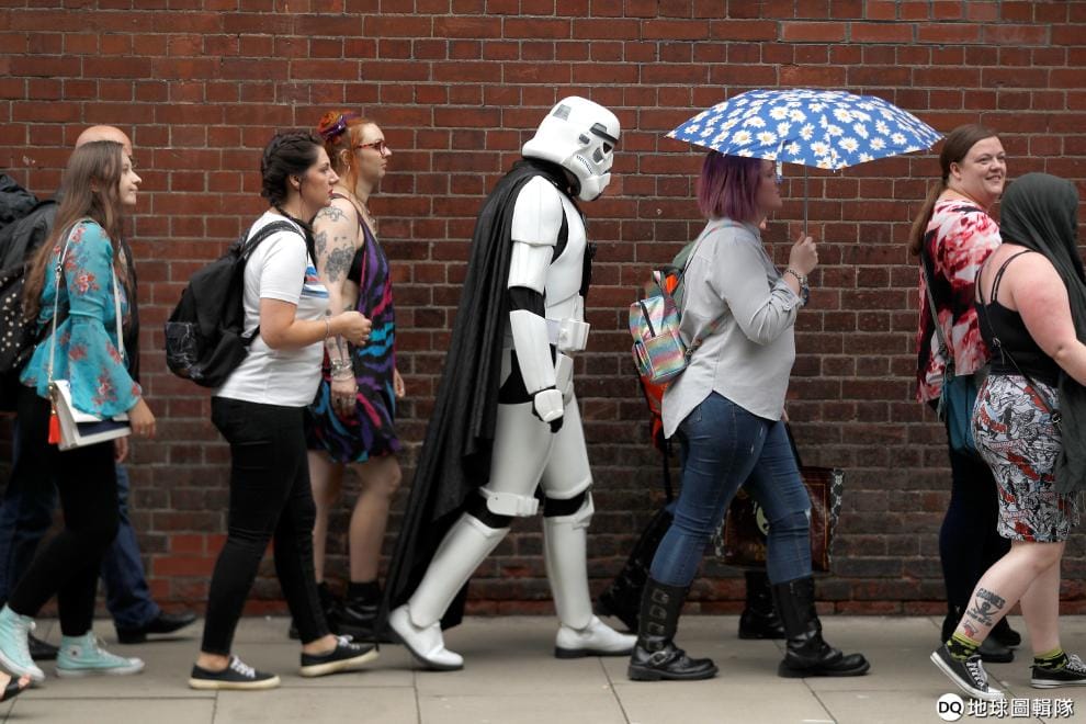 在 2019倫敦電影動漫展上,一名參觀民眾打扮成《星際大戰》電影中的帝國風暴兵,混在人群中前往會場。