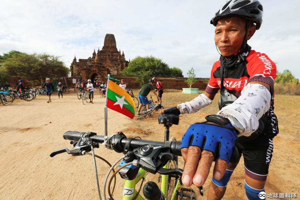 在近日被聯合國教科文組織(UNESCO)列為世界遺產的蒲甘(Bagan)佛塔前,一群單車騎士騎著插有緬甸國旗的單車前來慶祝。